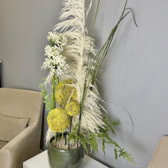 картадерия – 1 шт.агапантус искусственный – 3 шт.плюмозус искусственный – 2 шт.осока искусственная – 7 шт.шары из натурального мха – 3 шт.Кашпо керамика – 1 шт.