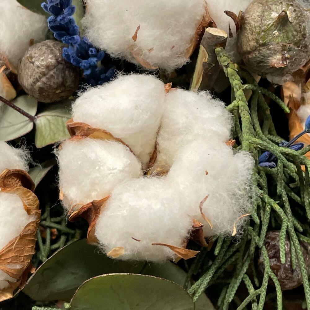 Хлопок натуральный – 13 шт.Лаванда (сухоцвет) – 11 шт.Эвкалипт – 1 шт.Фисташка – 1 шт.стакан кофейный – 1 шт.бумага упаковочная – 1 шт.Лента – 1 шт.