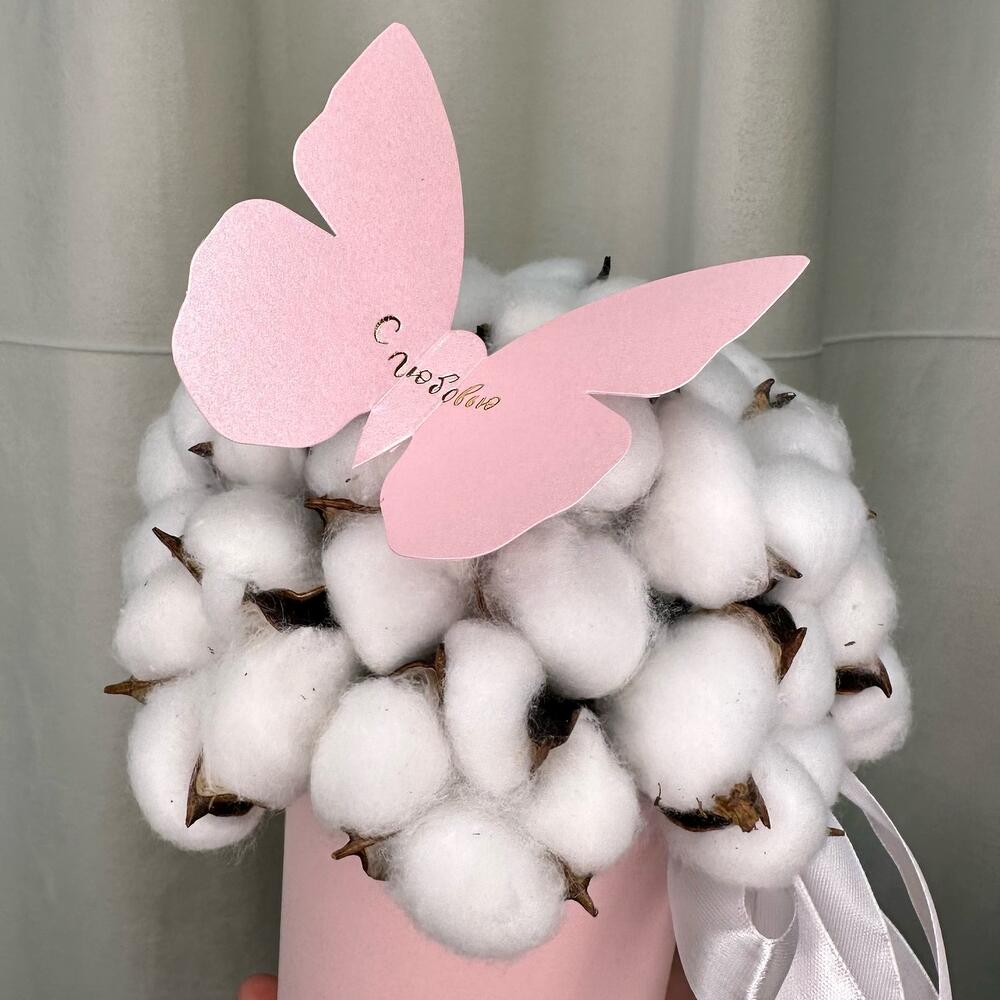 Хлопок натуральный – 15 шт.Шляпная коробка – 1 шт.Лента атласная – 1 шт.Открыточка с вашими пожеланиями – 1 шт.