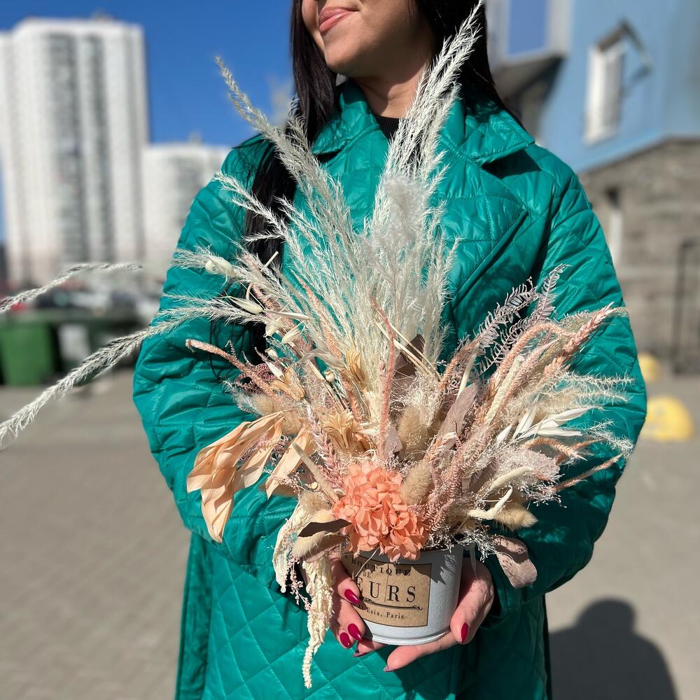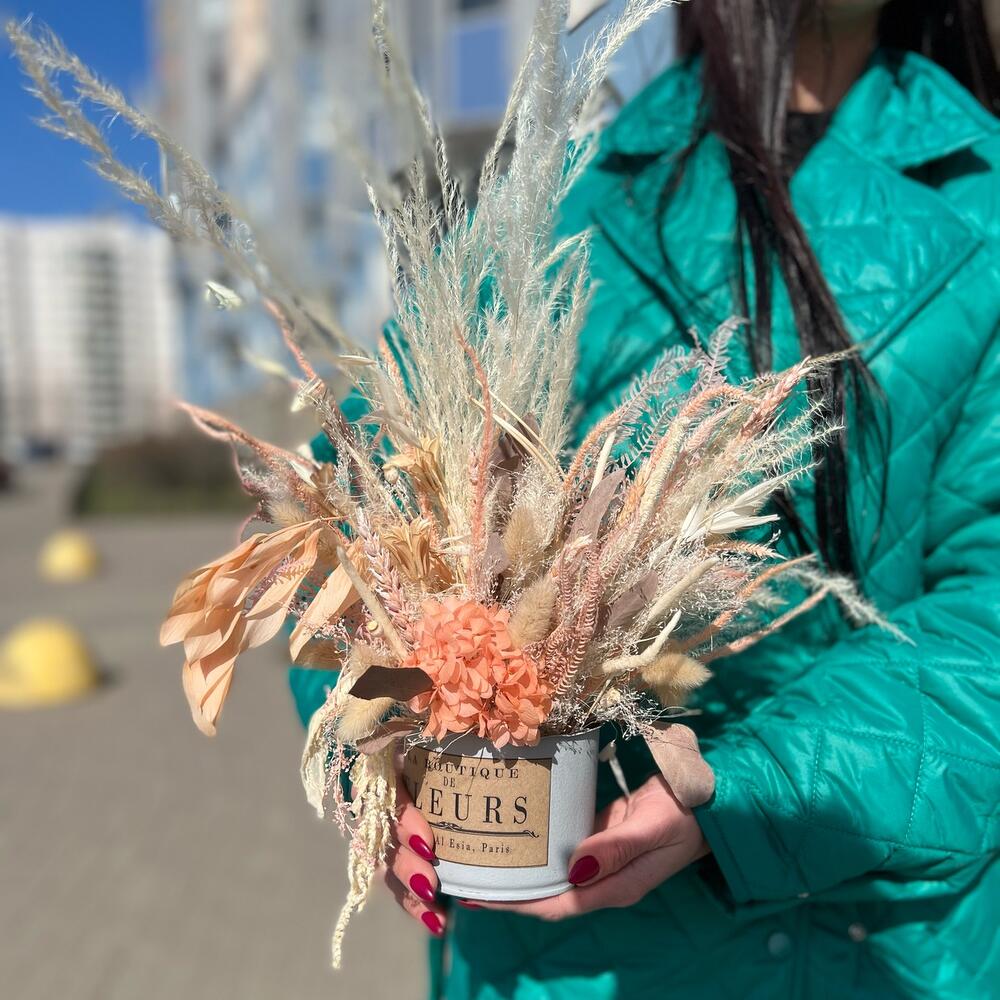 Гортензия – 1 шт.Пшеница – 3 шт.Оазис флористический – 1 шт.Кашпо жестянное – 1 шт.овес сухоцвет – 5 шт.кортадерия – 1 шт.амарант стабилизированный – 1 шт.мискантус белый – 5 шт.