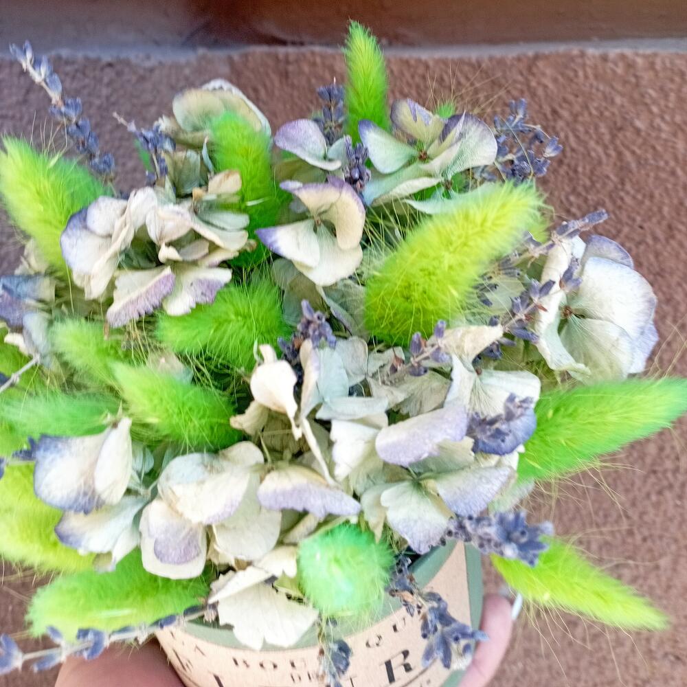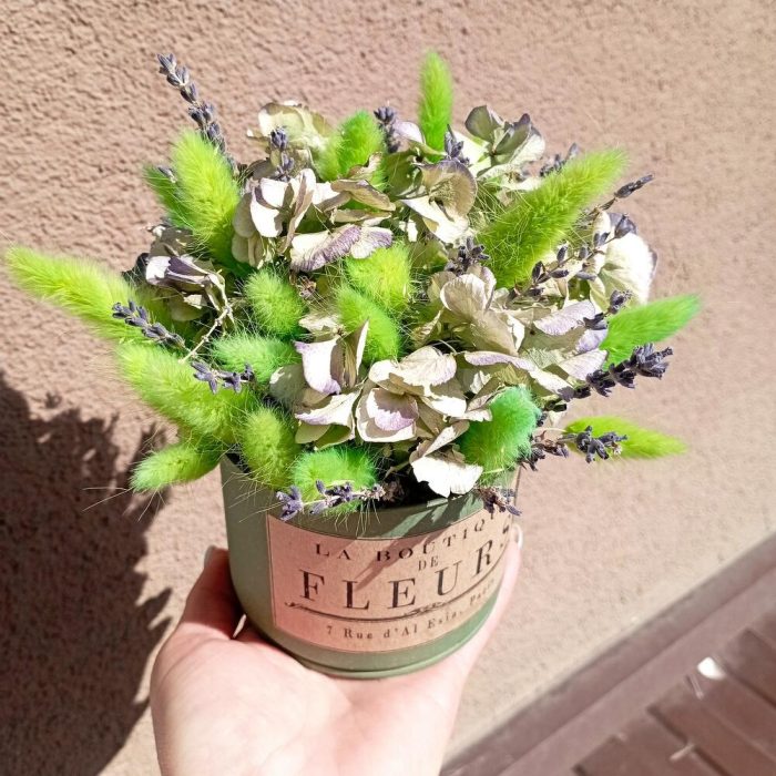 Лаванда (сухоцвет) пучок – 2 шт.Кашпо металлическое – 1 шт.Оазис флористический – 1 шт.лагурус пучок – 3 шт.гортензия стабилизированная – 1 шт.