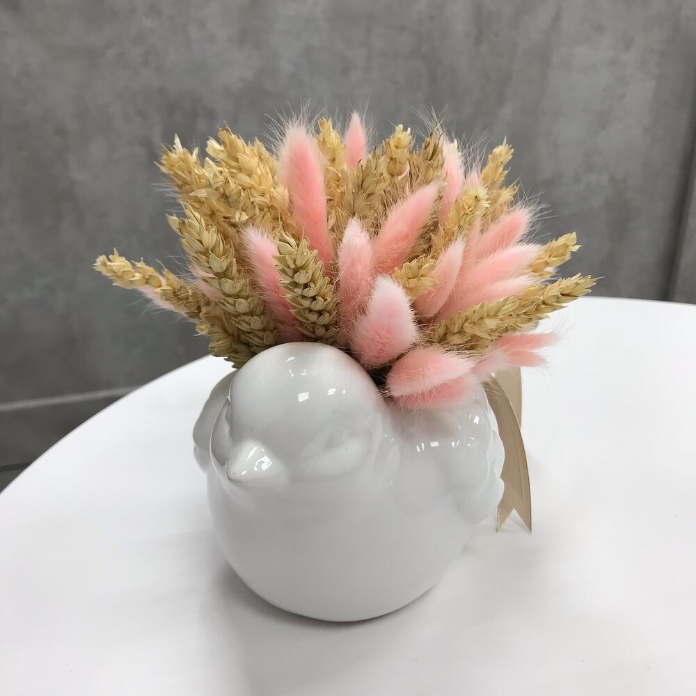 Лента атласная – 1 шт.Оазис флористический – 1 шт.лагурус пучок – 5 шт.колосья пшеницы пучок – 5 шт.птица декоративная керамика – 1 шт.