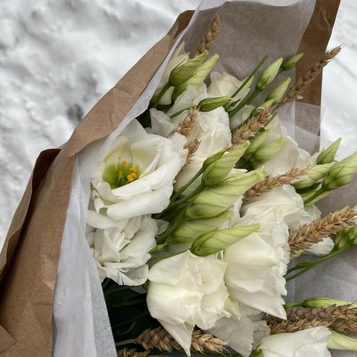 Лизиантус – 7 шт.Пшеница (сухоцвет) – 15 шт.Упаковка – 1 шт.Открытка мини – 1 шт.