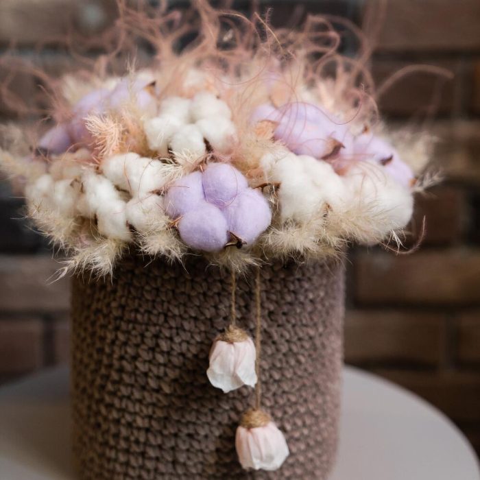 Ажурная роза с эвкалиптом в кашпо ручной работы