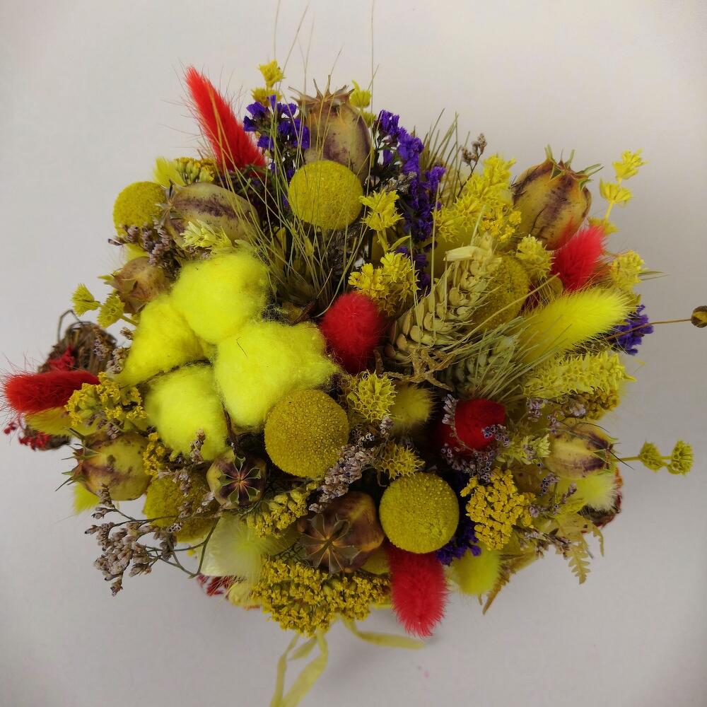Кашпо натуральное – 1 шт.Оазис флористический – 1 шт.Краспедия желтая – 7 шт.сухоцвет желтый – 15 шт.Статица – 1 шт.Лагурус (сухоцвет) – 25 шт.Хлопок – 1 шт.Нигелла сухоцвет – 9 шт.лимониум сухоцвет – 1 шт.Пшеница (сухоцвет) – 5 шт.Папоротник – 1 шт.