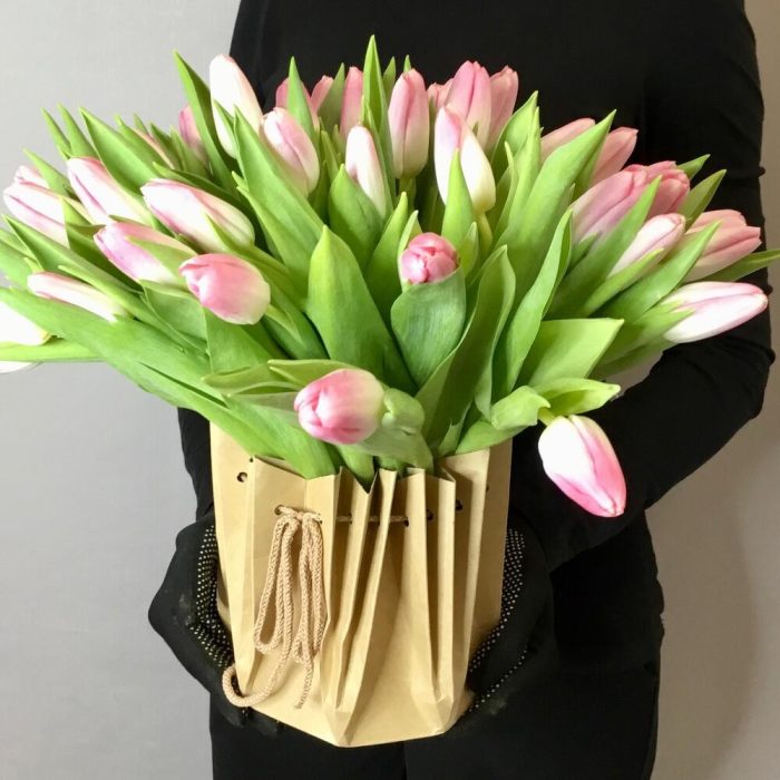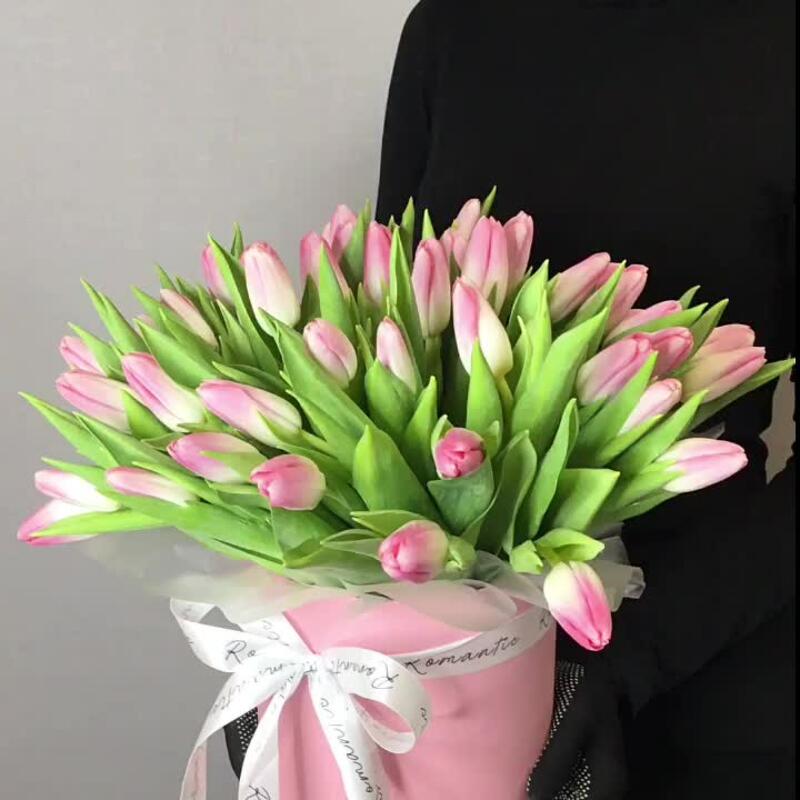 Тюльпан Голландский – 51 шт.Аквабокс – 1 шт.шляпная коробка 18*18 см – 1 шт.Пленка матовая – 1 шт.Лента атласная – 1 шт.