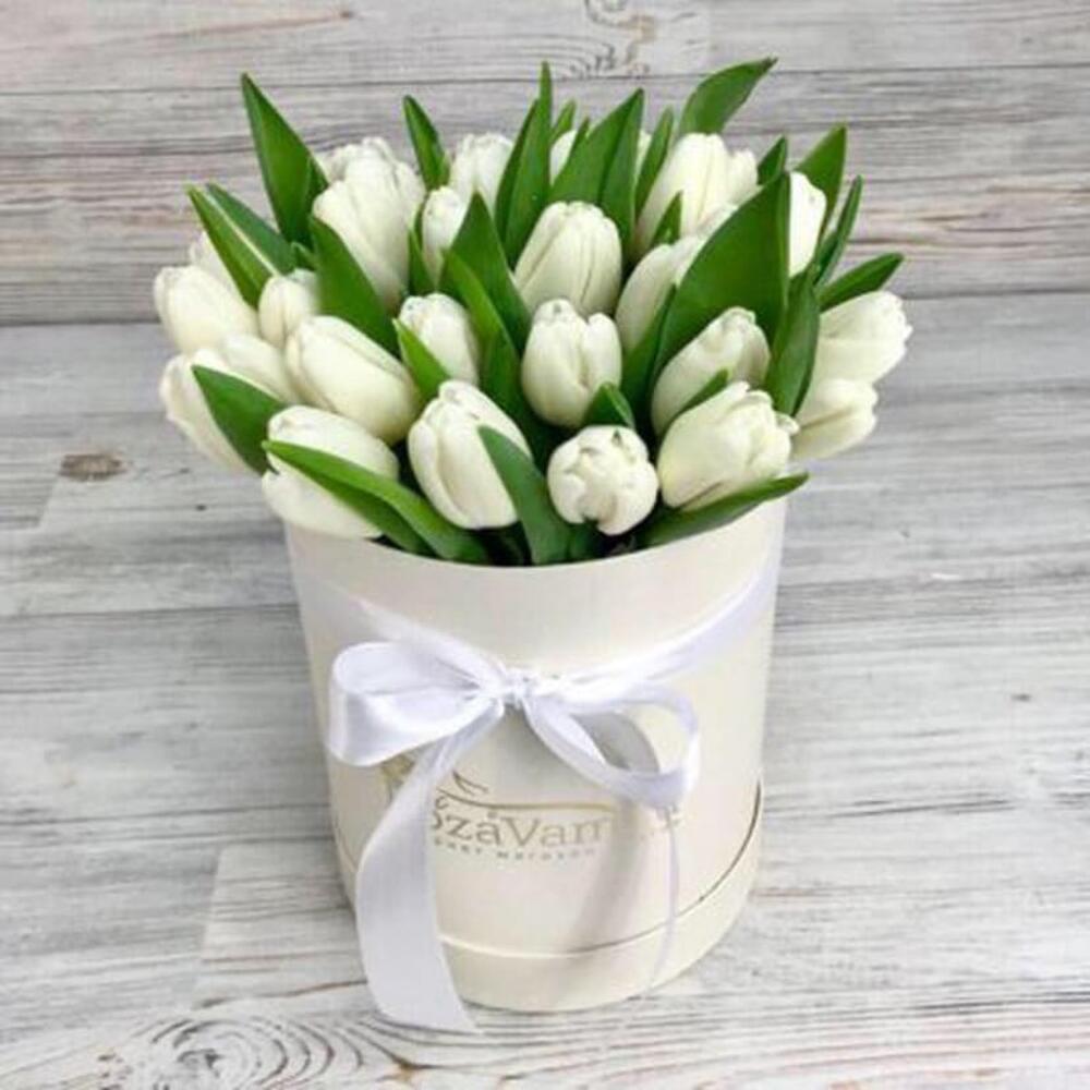 Шляпная коробка – 1 шт.Тюльпан белый – 25 шт.Оазис флористический – 1 шт.