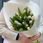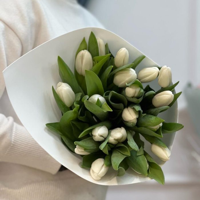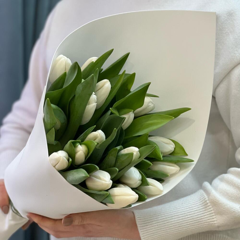 Букет белых тюльпанов (19 шт) в стильном оформлении «Весеннее настроение»