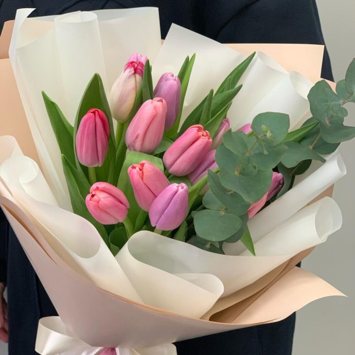 Тюльпан – 15 шт.Эвкалипт – 1 шт.Дизайнерская упаковка – 2 шт.Атласная лента – 1 шт.