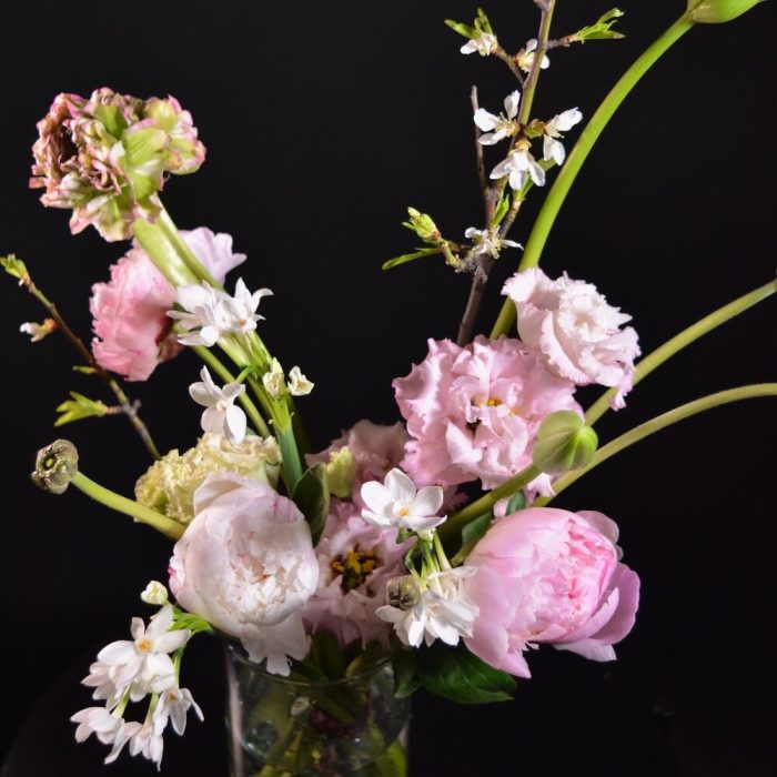 Пион – 3 шт.Ранункулюс – 1 шт.ветка цветущая – 1 шт.Нарцисс – 3 шт.Тюльпан – 2 шт.Лизиантус – 2 шт.