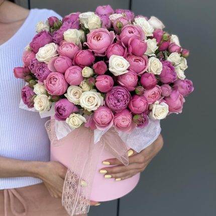 Бархатный цилиндр из голубых диантусов, розовых пионов и ароматной маттиолы